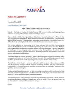 By Mercy Chelangat The Media Council of Kenya (MCK) implemented its revised Code of Conduct for Media Practice on Tuesday...