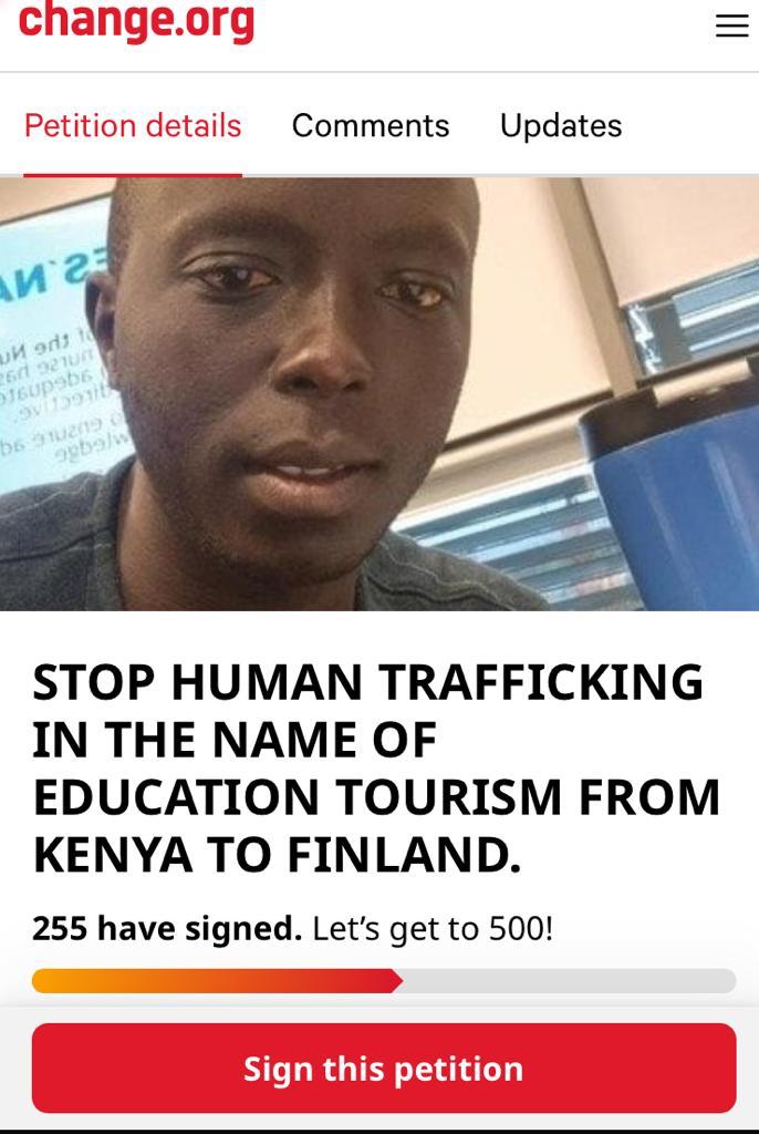 A Kenyan  living in Helsinki, Finland has  petitioned  both the Kenya and the Finland  government over claims of human trafficking in the  name of Education tourism.