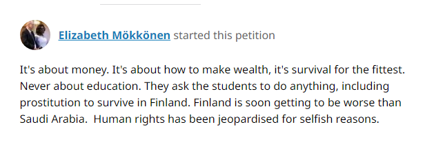 “The monsters within. The angels of Darkness. The heartless humans. What is inside these contracts? What were the students and their families signing for? Why hide these contracts? We need to give updates on the ROT within and without the Finnish and Kenyan governments that  lead to a student committing suicide on the 18th 04.2023 in Finland  and many more left depressed and at the verge of death” She Claims  in her petition.