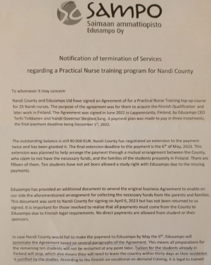 The petition comes at a time when 10 Nursing students out of  the 25  from Nandi County and  who are  currently pursuing a practical training top-up program in Finland  have been issued a 30 day notice of termination of  services for failing to pay their school fees as agreed in a  document  signed  between the County government of  Nandi and Edusampo Ltd  Ceo Terhi Toikkanen June 2022.