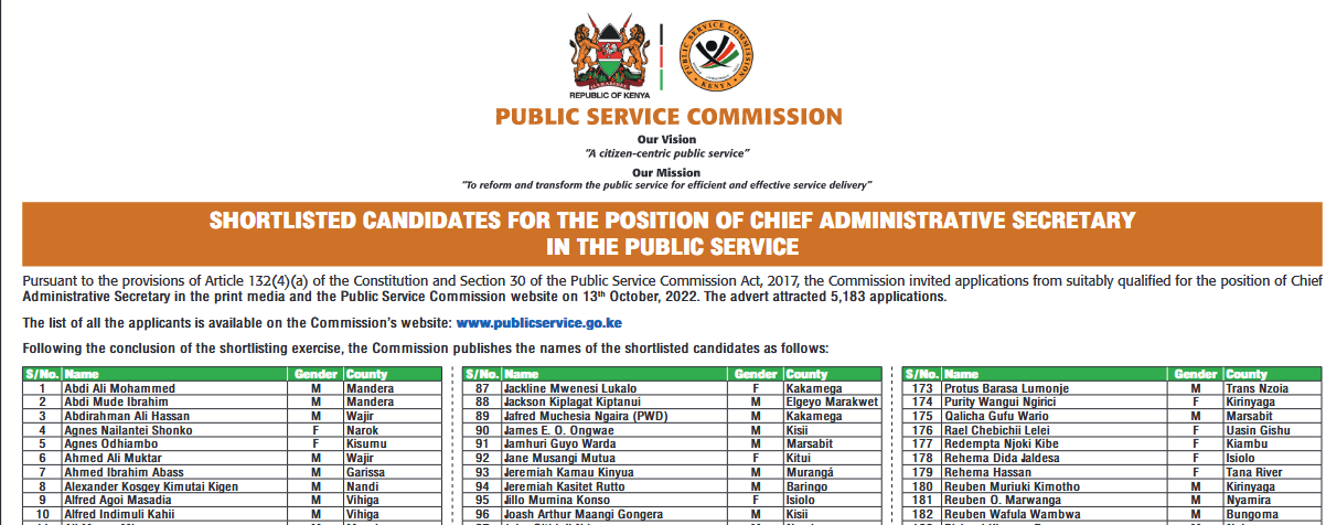 “Pursuant to the provisions of Article 132(4)(a) of the Constitution and Section 30 of the Public Service Commission Act, 2017, the Commission invited applicants suitably qualified for the position of Chief Administrative Secretary in the print media and the Public Service Commission website on 13th October, 2022. The advert attracted 5,183 applications.” The advert read.