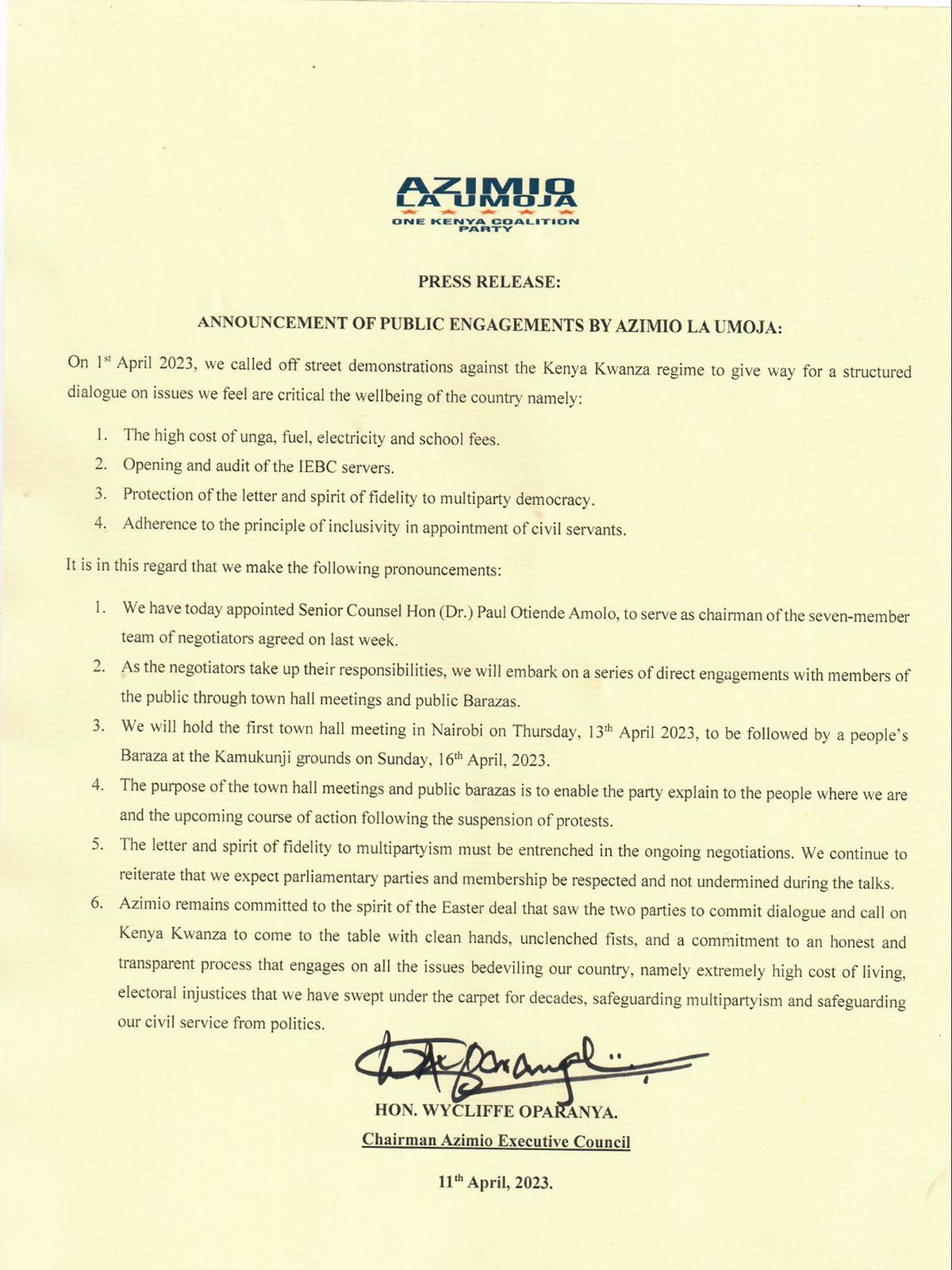 Azimio la Umoja One Kenya announces  the beginning of direct  engagement series with members of the Public through Town hall meetings and public Barazas.
