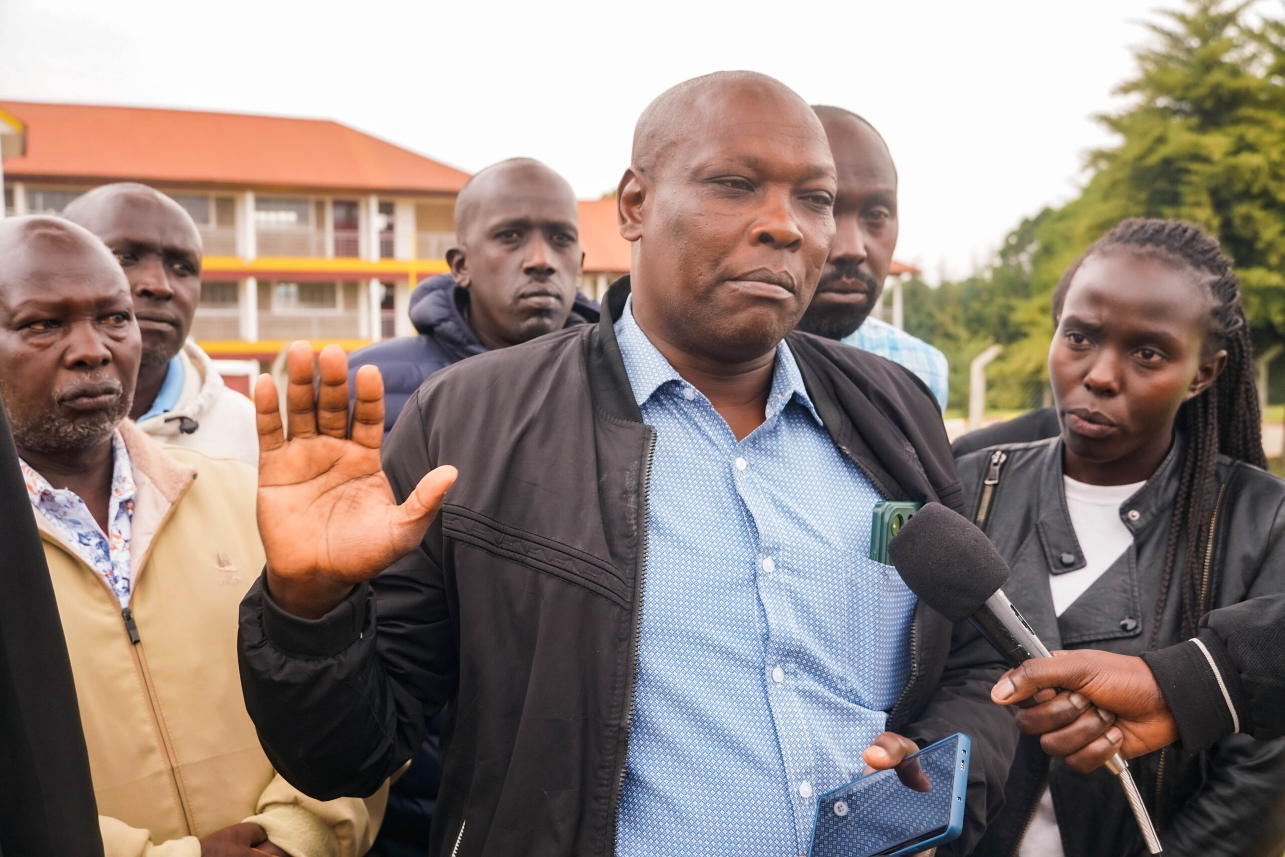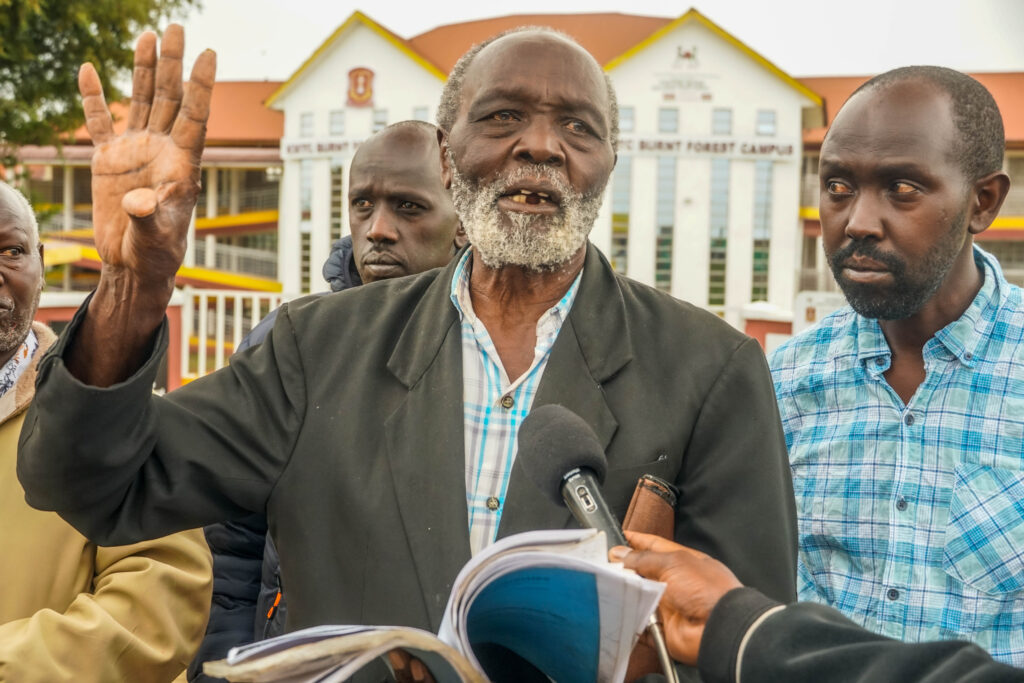 Mr. Francis Seratei, 84, a resident of Burnt Forest, addresses the media outside KMTC Burnt Forest campus, displaying documents he says prove his legal ownership of the disputed land. He is appealing for compensation after the court nullified his ownership and ordered his eviction