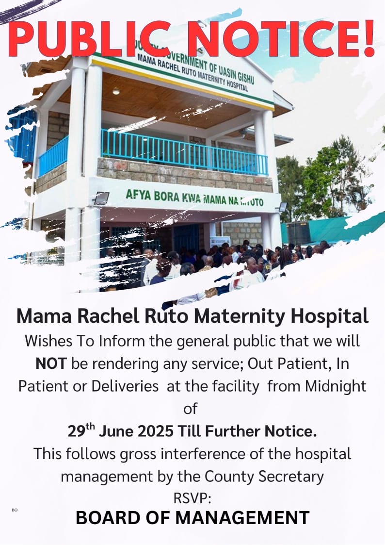 Uasin Gishu County Chief officer for Promotive and Preventive Health, Dr. Paul Wangwe Ongeti, has dismissed a notice issued by the Mama Rachel Ruto Maternity Hospital Board announcing the indefinite suspension of hospital operations.