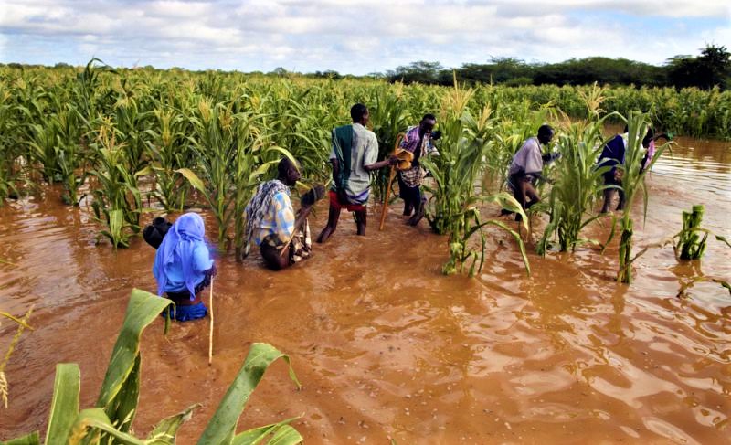 Men cross a flooded maize field .Courtesy/SciDev.Ne