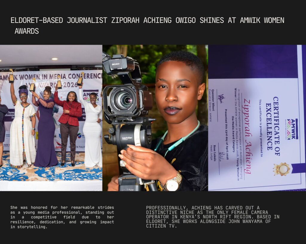 Professionally, Achieng has carved out a distinctive niche as the only female camera operator in Kenya’s North Rift region. Based in Eldoret, she works alongside John Wanyama of Citizen TV, consistently delivering compelling visuals and high-quality footage from the frontlines of news coverage.
