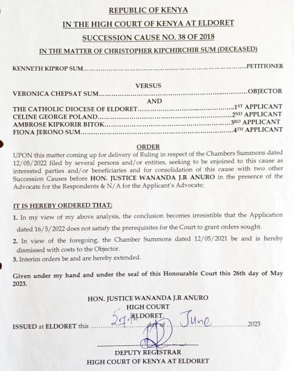The court case sheds light on the complex land ownership challenges in the region. It is important to note that the late Mr. Sum had appointed his widow, Veronicah Sum, as the sole administrator of his estate upon his passing 39 years ago.