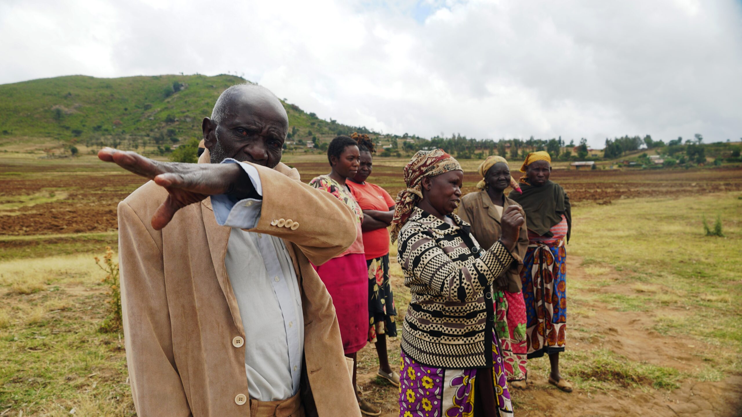 Edel Sum, alongside lawyer Momanyi Gichana (black suit), and human rights activist Kimutai Kirui (right), stand on the disputed 1,300-acre land invaded by strangers