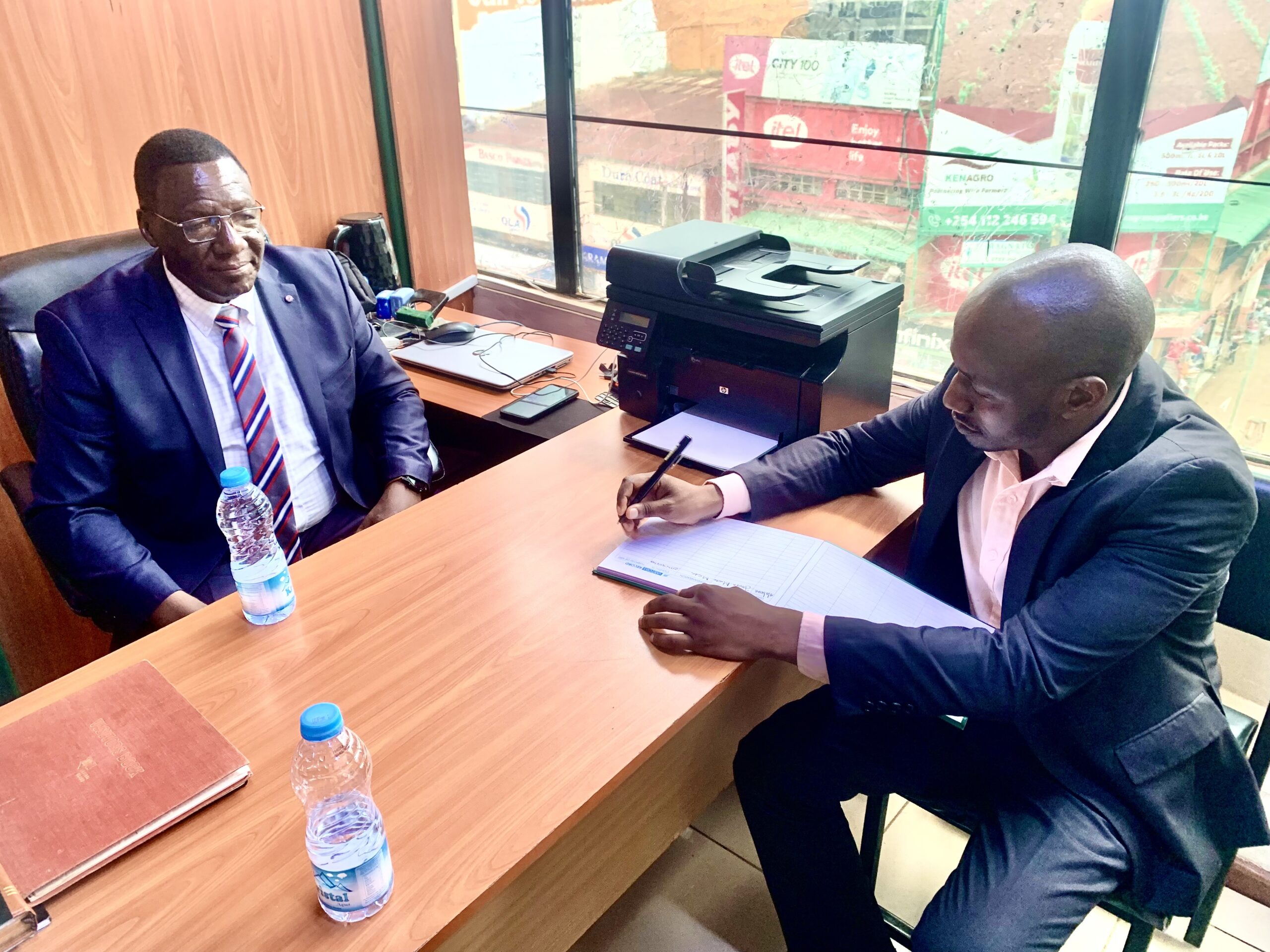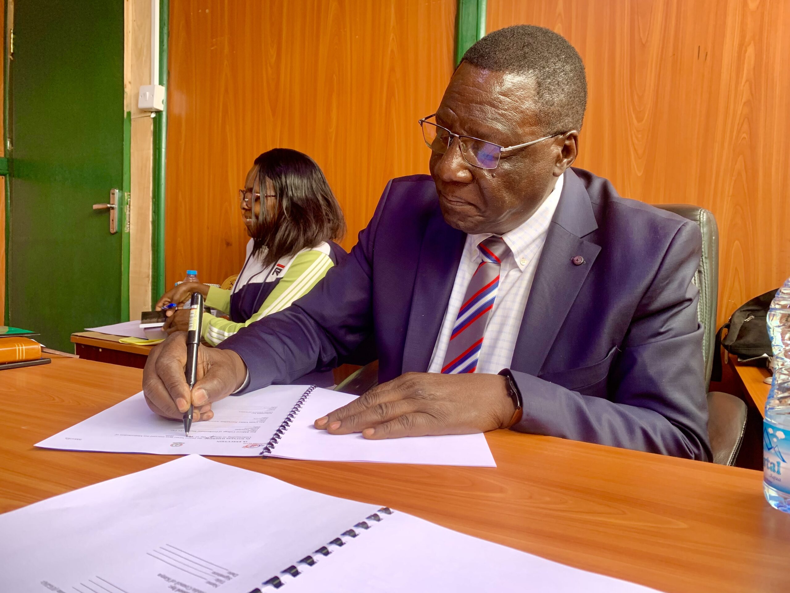 Joseph Mecha signs the Memorandum of Understanding as an official witness, overseeing the partnership between Eldoret College of Professional Studies and the Eldoret Media Hub.