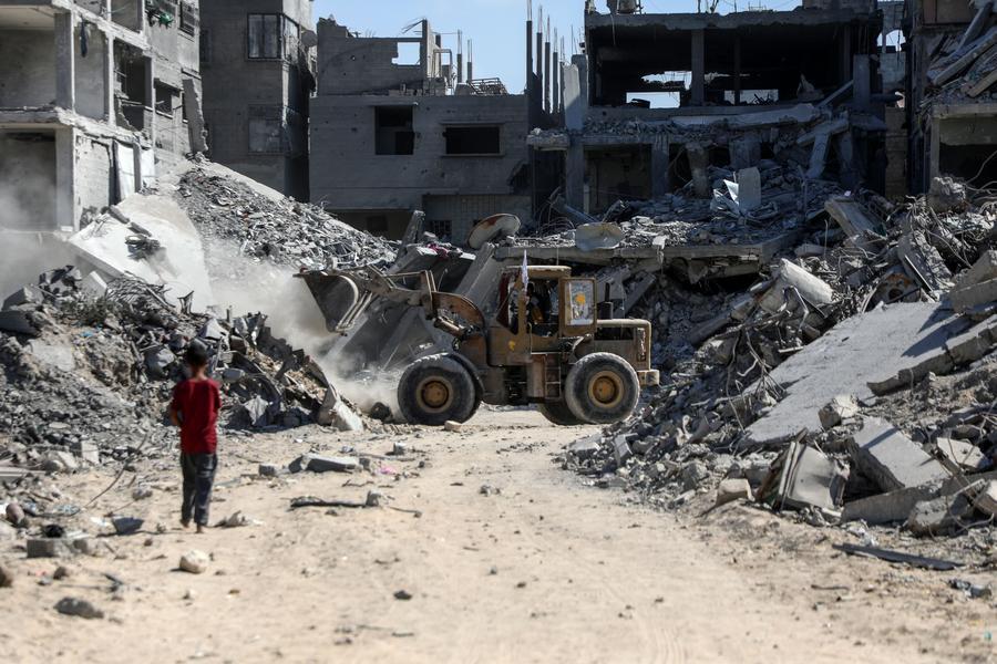 A heavy machinery removes debris from a street in Gaza City, on Oct. 19, 2025. (Photo by Rizek Abdeljawad/Xinhua)