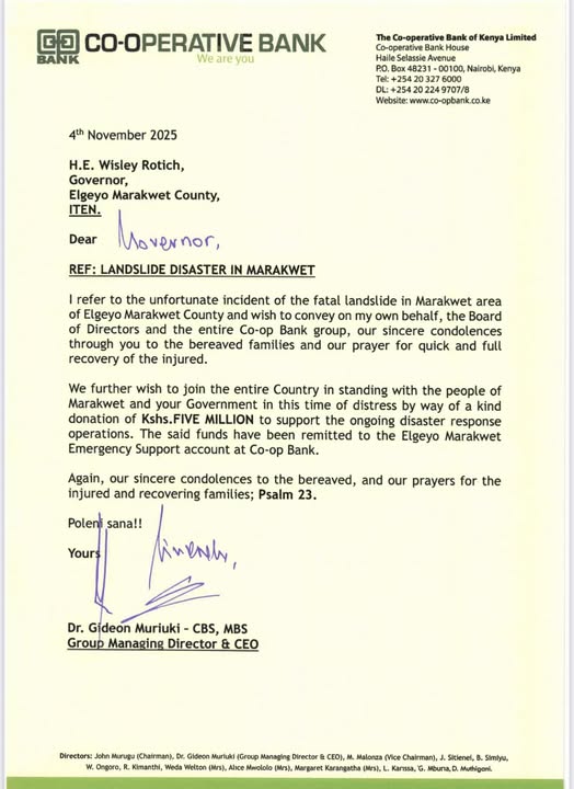 “I want to sincerely thank the CEO of Co-op Bank Kenya, Dr. Gideon Muriuki, and his team at Co-op Bank for such a kind gesture and support toward the victims of the unfortunate landslide in our county,” said the governor. “This will go a long way towards alleviating the suffering that the families are going through.”