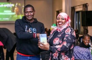Hubzmedia cameraman and media trainer Augustine Were receives a mobile phone from Safaricom during the media engagement dinner held at Eka Hotel on Monday.