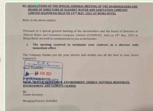 The community has issued a 24 hrs ultimatum to Eldowas to reinstate the local youth that have been dismissed as well as reinstate the fired director failure to which they will be forced to disrupt water flow from Chebara dam to Eldoret.