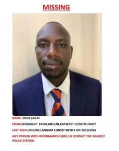 The disappearance of Enos Lagat has ignited widespread concern and demands for accountability from authorities, as over 300 residents of Cheptiret in Uasin Gishu County, along with his family and friends, seek answers. Lagat’s reported abduction outside Uchumi Langata has spurred discussions on social media, with fears for his safety and calls for his immediate release echoing across platforms.