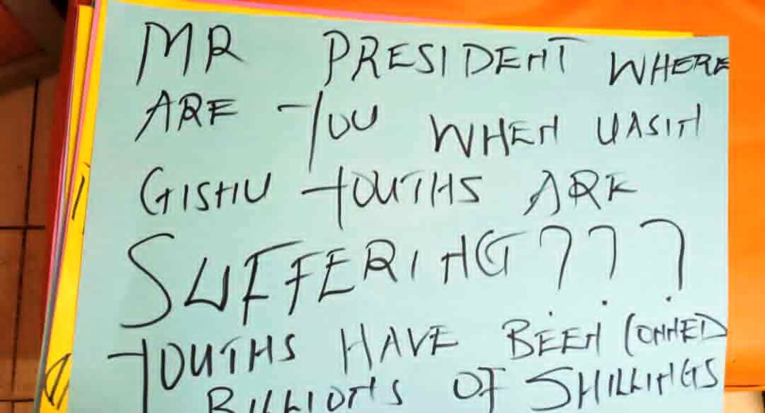 The Young men and women raised their placards while Uasin Gishu Governor Jonathan Bii was introducing other government Dignitaries present at the prayer and thanksgiving Christmas meeting.