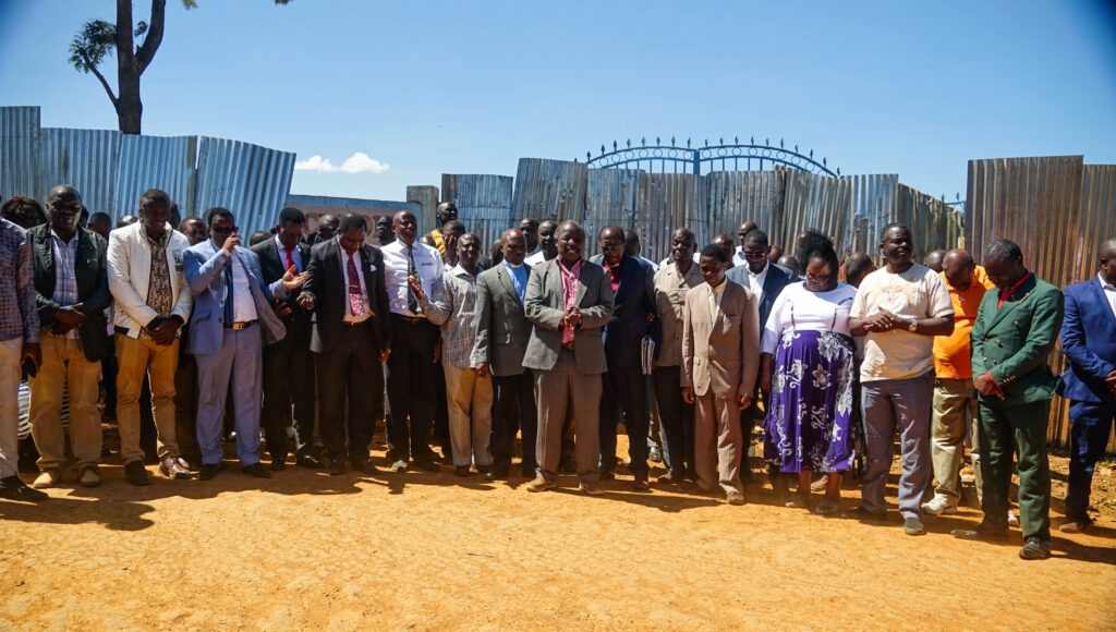 A section of Eldoret bishops gathers outside the demolished Logos Revival Ministries, condemning the destruction and calling for justice.