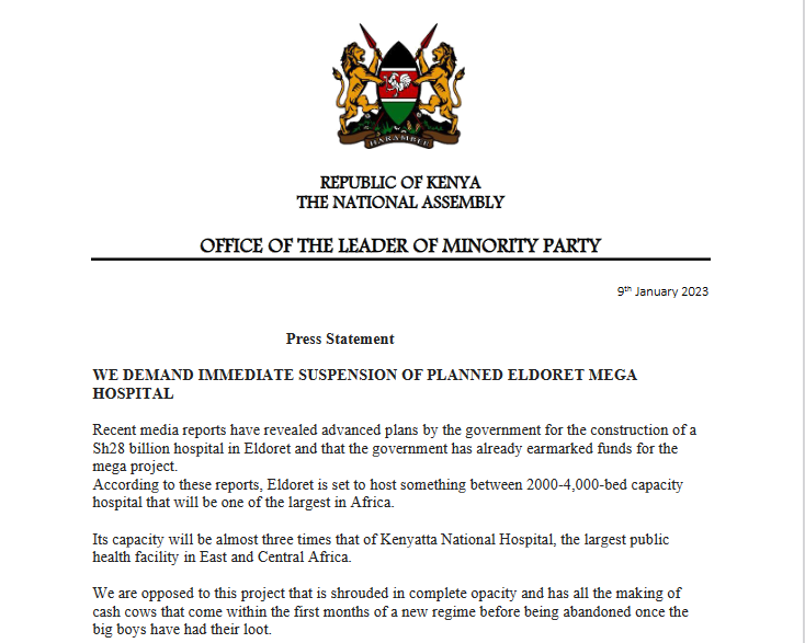 The Kenya Medical Practitioners, Pharmacists and Dentists Union (KMPDU) has condemned attempts to halt the planned construction of an Ultra-Modern  Hospital in Eldoret that will cost the Kenyan taxpayer Ksh 28B.