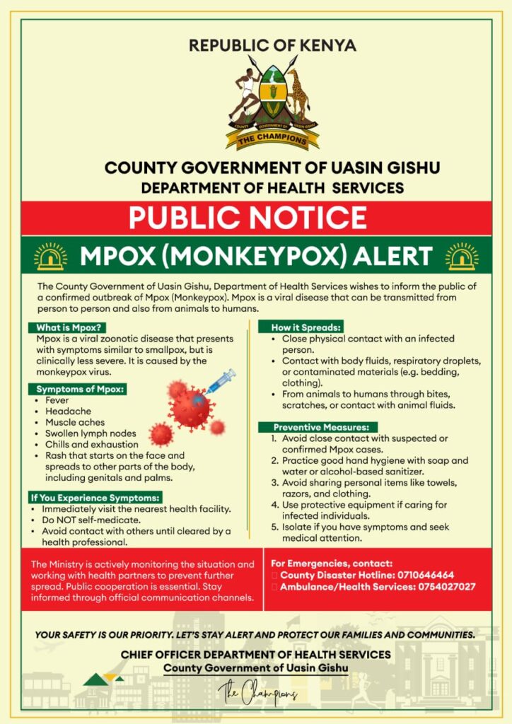 The County Government of Uasin Gishu has confirmed a case of Mpox (Monkeypox), sparking a public health alert across the region.