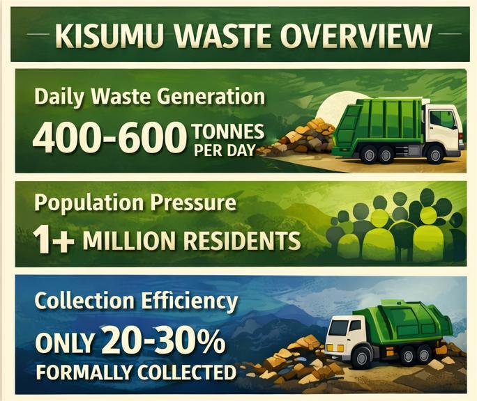Despite these advancements, Kisumu continues to face significant waste management challenges. The city generates between 400 and 600 tones of waste , driven by a population of over one million residents. However, only 20 to 30 percent of this waste is formally collected, leaving a large portion to be disposed of through informal methods such as open dumping, burning, or burial. These practices contribute to environmental degradation, air pollution, blocked drainage systems, and the spread of diseases such as cholera and typhoid.