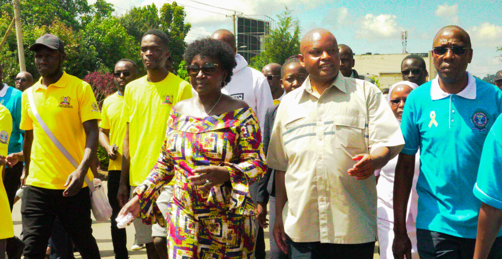 Uasin Gishu County woman representative Gladys Shollei and the MTRH CEO Dr Wilson K Aruasa during a sensitization walk against suicide.
