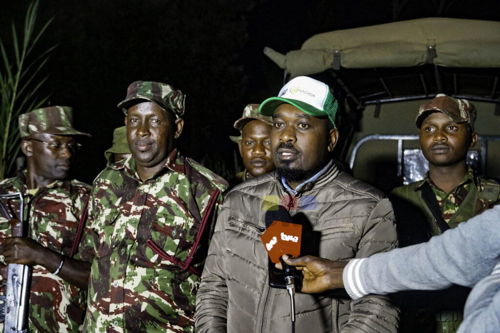 NACADA Deputy Director Simon Mwangi addresses the media during a night-long multi-agency crackdown on drug dens and illicit brew operations in Munyaka, Ainabkoi Sub-County. Photos by Kemuma Achieng.