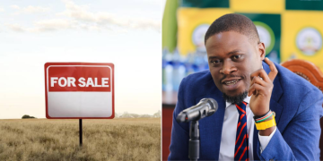 A collage of Nairobi Governor Johnson Sakaja right and land on sale sign left. Photo/The Kenya Times.