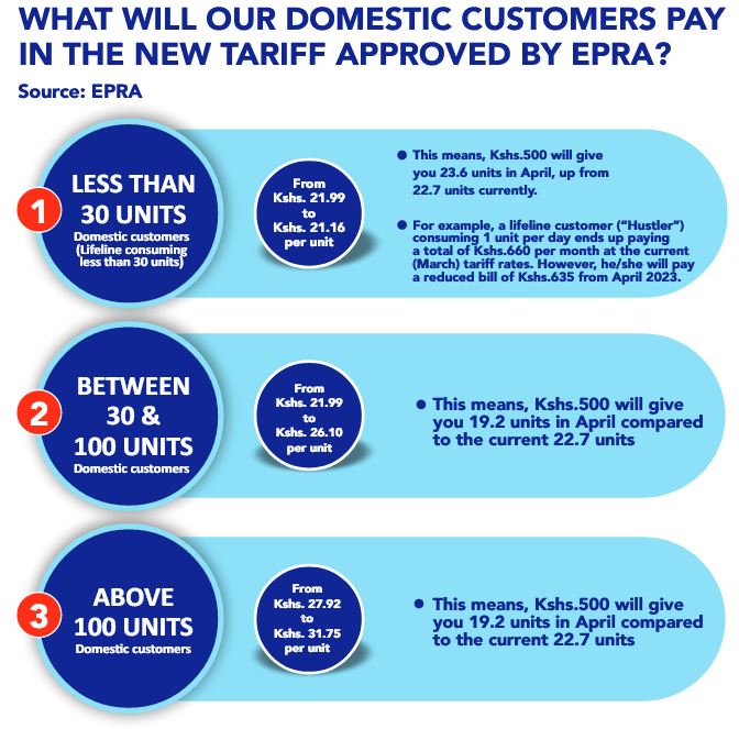 A Kenyan spending one unit a day will now spend Ksh 635 from the current KSh 660 under the new tariff.