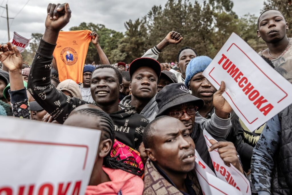 Opposition supporters hold posters that read 'Tumechoka' (Swahili for: We are tired) as they participate in a public rally against the high cost of living after the passing of the finance bill at the Kamukunji grounds in Nairobi, Kenya on July 7, 2023. (Photo by Luis Tato / AFP)