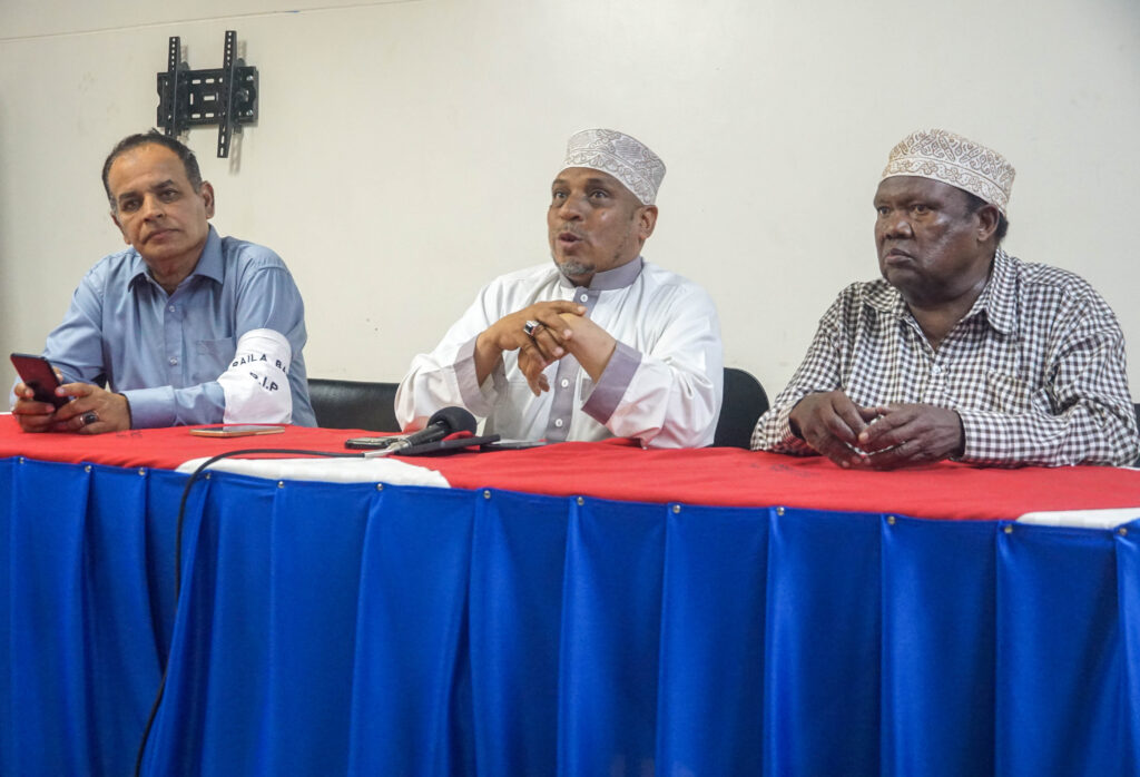 Muslim leaders in Eldoret Led by Sheikh Abubakar Bini (c) Zulfikar Bachu (L) and Hassan Koskey address the media as they pay tribute to the late former Prime Minister Raila Odinga for his contribution to religious freedom and national unity/Photo Kemuma Achieng