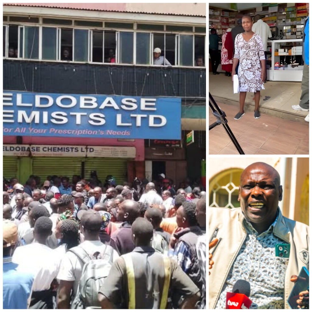 A collage image showing Eldobase Pharmacy in Eldoret, Pauline Osoro—the mother of the child involved in the reported medication error—and human rights activist Kimutai Kirui, who has called for due process and an end to mob justice. Photo courtesy: HubzMedia.