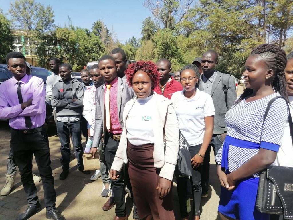 Some of the 8,000 First Choice Victims and their parents outside the Uasin Gishu County Assembly/File Photo