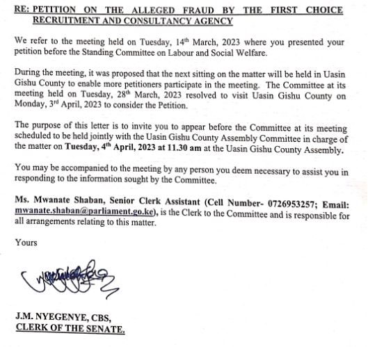 The Senate Standing Committee on  Labour and Social Welfare  will on Monday 3rd  and 4th of this month meet victims of  alleged  fraud by the First Choice recruitment  and consultancy agency in Eldoret.