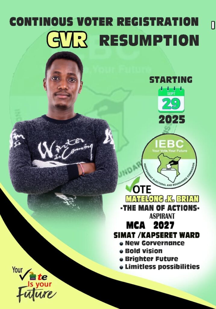 In Simat/Kapseret Ward, Uasin Gishu County, a new wave of leadership is emerging, led by Matelong K. Brian, an aspirant for the position of Member of County Assembly (MCA). Brian has pledged to bring meaningful change to the community through visionary leadership and development-focused governance.
