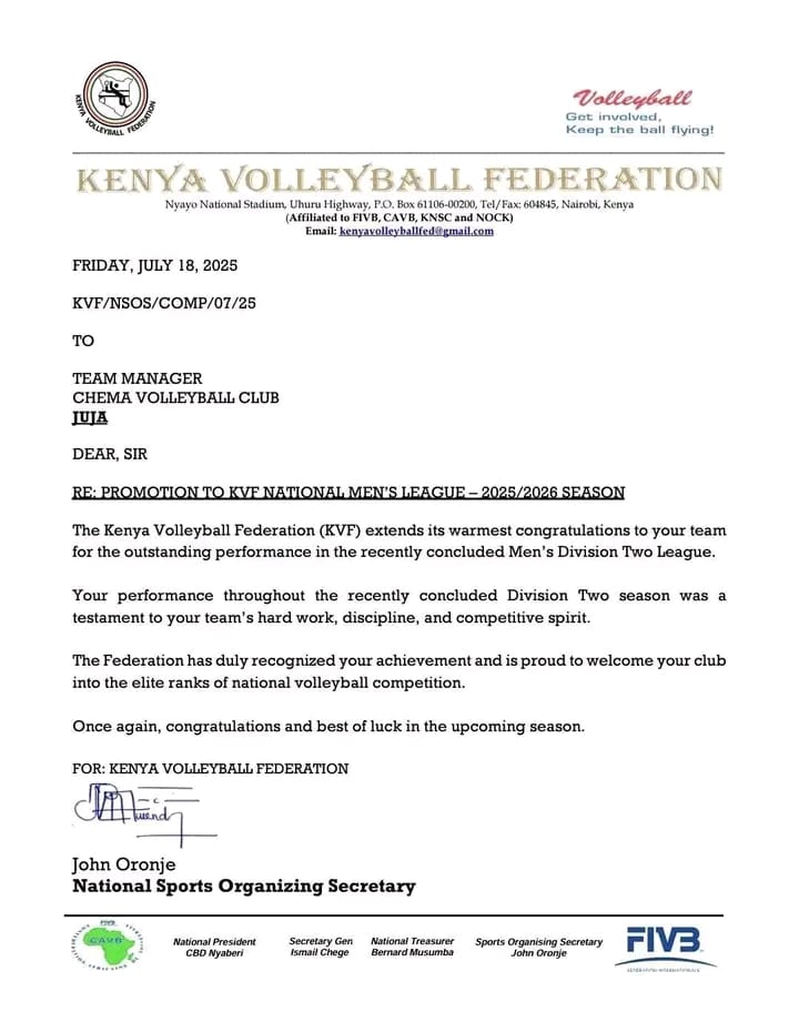Meanwhile, Chema Volleyball Club has earned a spot in the top flight of Kenyan volleyball. Their promotion, confirmed by the KVF in a letter dated July 18, 2025, comes after a dominant campaign in the Division Two League.