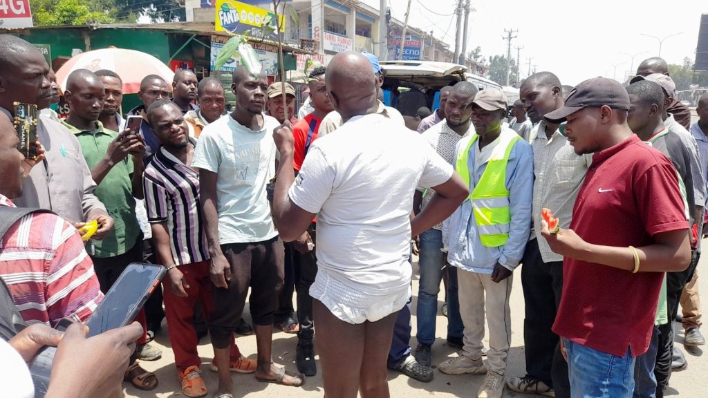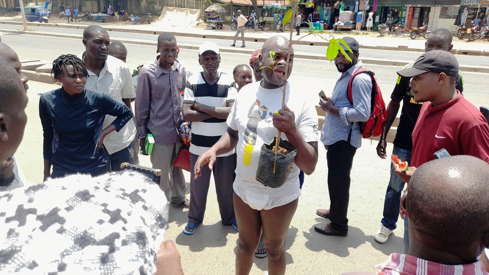 Getumbe who had won a diaper caused a stir in various stopovers as scores of members of the public struggled to have a glimpse of the artist who wore a diaper.