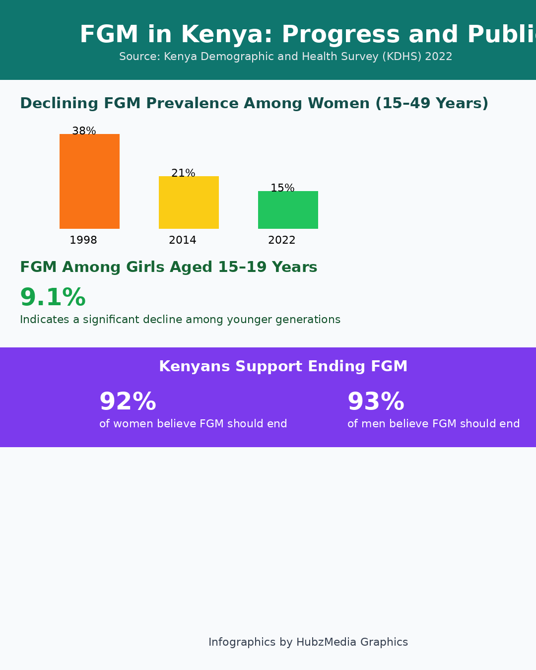 According to the Kenya Demographic and Health Survey (KDHS) 2022, national FGM prevalence among women aged 15–49 has declined to 15 percent, down from 21 percent in 2014 and 38 percent in 1998. Among girls aged 15–19, prevalence has dropped to 9.1 percent, signaling progress among younger generations. The survey also shows that 92 percent of women and 93 percent of men believe the practice should end.