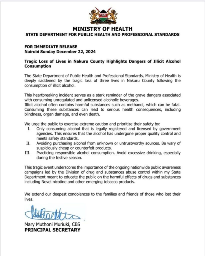 The Ministry of Health has issued a heartfelt warning following the tragic deaths of three individuals in Nakuru County linked to the consumption of illicit alcohol.